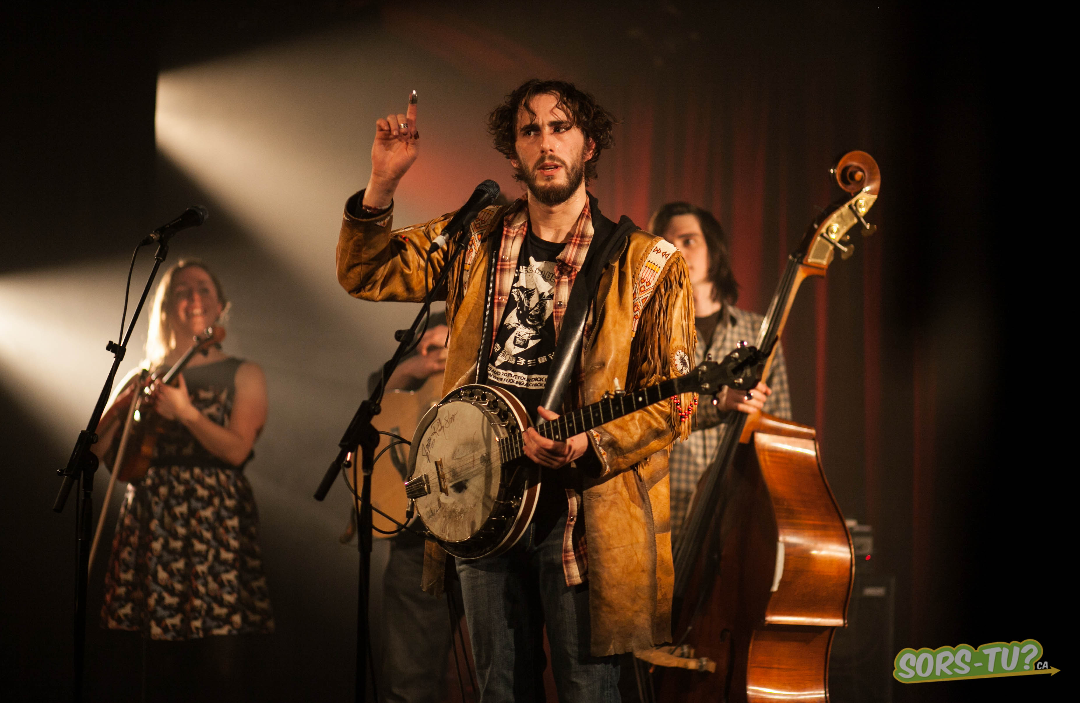 Dylan Perron est d’abord venu seul sur la scène pour interpréter une ballade, dont la qualité du texte était assez remarquable. Puis le groupe au complet, violon, guitare, contrebasse et mandoline, est arrivé sur scène pour accompagner Dylan Perron sur une autre ballade. Il y avait alors un seul micro pour toute la formation, et on a rapidement ressenti la maîtrise sans égale des instruments du groupe.