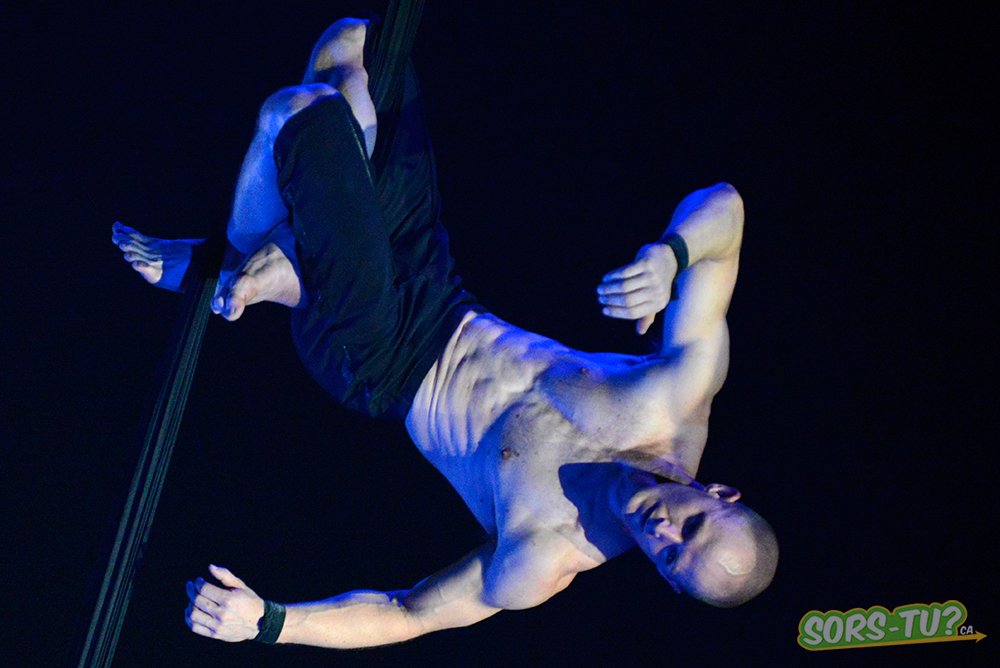 Ensuite, on enchaîne avec un numéro de tissu dont le niveau de difficulté n’était pas très élevé. Par contre, la grâce et l’esthétisme y sont. Les femmes portent des vêtements noirs légers alors que les hommes ont le haut du corps dénudé.