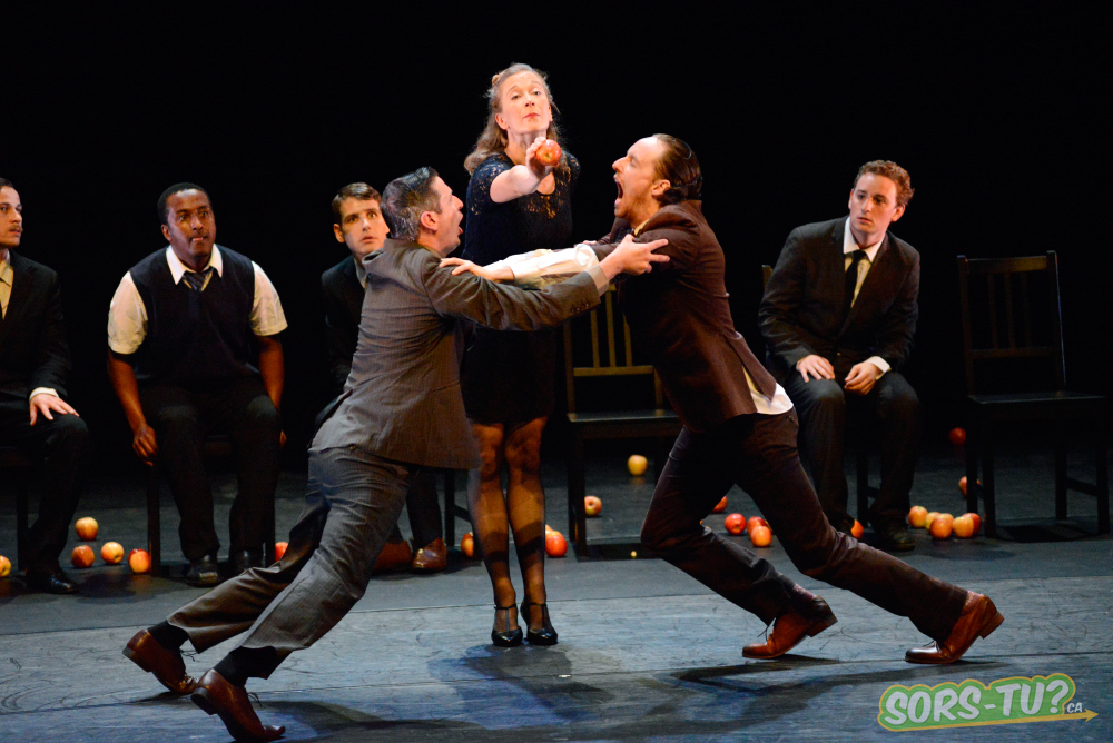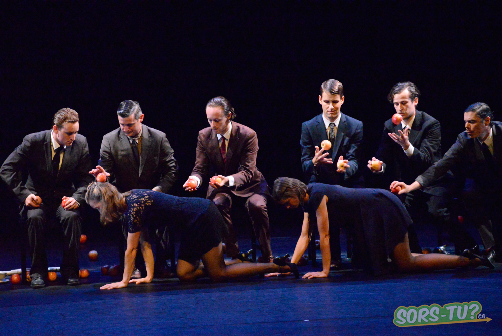 Derrière le costume-cravate sombre ou la petite robe stricte, les corps disent tant de choses. Les pommes et la vaisselle remplacent les balles, la danse rapide se fait sautillante et l’élégance des années 1940 est de mise entre nonchalance et comédie. La précision de la jonglerie, les pas, les regards, les sourires, la musique très french-cancan emmènent le spectateur dans une autre époque.