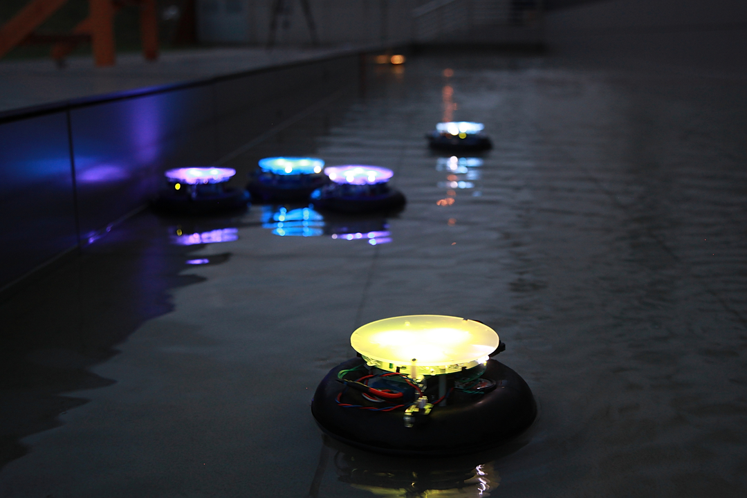 Juste à côté, un bac d’eau carré était déjà installé, avec un petit robot lumineux sur la surface de l’eau. « Il y aura plusieurs robots comme celui-là, qui navigueront à l’intérieur du bassin en émettant de la lumière », explique Marie-Eve Bonneau, adjointe à la présidence. C’est l’oeuvre Vessels, des artistes Sofian Audry, Stephen Kelly et Samuel St-Aubin.
